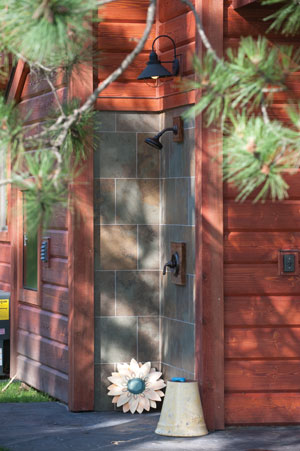 With outdoor showers, there’s a wide range of possibilities. A low-tech solar unit, like the one in the main article, scores high on simplicity but lower on comfort and elegance. At the other end of the spectrum is an outdoor shower like the one pictured at right – more complex, but offering all the comforts of an indoor shower. This outdoor shower is built into the exterior of the cabin and takes full advantage of existing plumbing and electrical utilities (for the overhead light), resulting in an elegant and highly functional shower that blends perfectly with the cabin’s exterior.